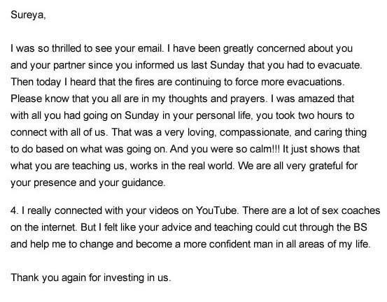“I did everything you said and we had an amazing night of spicyness and overall experience of lovemaking. We have had some of the most passionate beautiful lovemaking sessions the past two days. It has been a positive exploration of each other, and she has been so passionate and happy. Everything you’ve taught me has been so helpful. Thank you so much!”